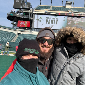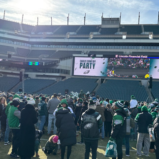 We got tickets to the Philadelphia Eagles Super Bowl send off thanks to Johnathan (who we missed). We got to go on the field, see the cheerleaders and drum line and swoop. Ran into Sean Holden and his gang. Saw Eric Emanuele from afar and cheered on the Birds as they headed out to New Orleans!