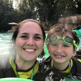 Our trainer's name was Amber, and our Dolphins name was Stella. There were nine people in our group, and we all took turns taking photos and doing commands. We then went two by two to the side of the lagoon and did our swim. We held onto the dorsal and pectoral fins and one-by-one Stella took us across the lagoon. It was amazing to see the joy on everyone's face. Another add-on I did was a celebration package. This is typically used for gender reveals or proposals but can be used for anything. It is limited to one per swim group and the dolphin will swim over a custom buoy to one person in the group. Mine was for Cam and had his Schwooperhero nickname on it. He loved it and the dolphin loved playing with the buoy - batting it around before bringing it over to him. The dolphin swim is an add-on to park admission - but in my opinion - worth the splurge if you have never had a dolphin encounter before.